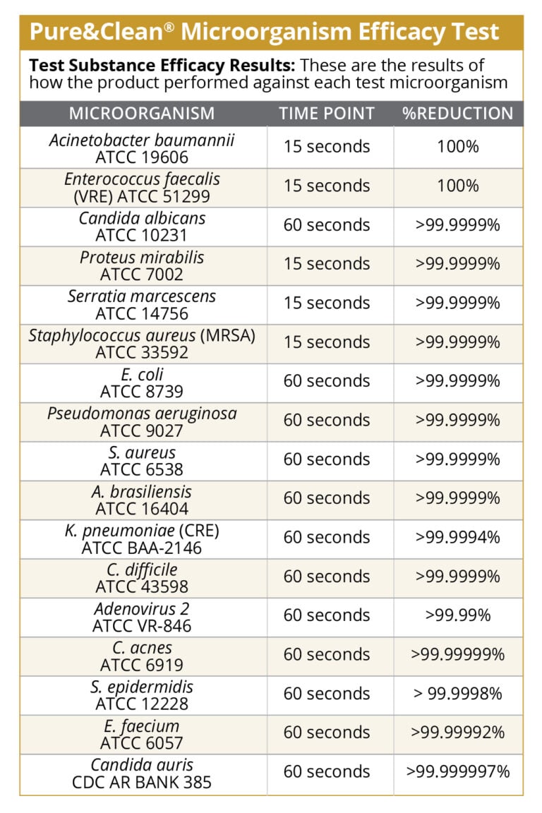 Pure&Clean® products contain HOCl, the same chemical compound produced naturally by the human body’s white blood cells to fight infection. Our patented hypochlorous solution helps reduce inflammation and common irritations. HOCl has been used for more than 100 years as a disinfectant for medical equipment and for dressing wounds because it is effective against a variety of microorganisms. In 60 seconds or less, Pure&Clean was 99.99% effective against pathogens such as: